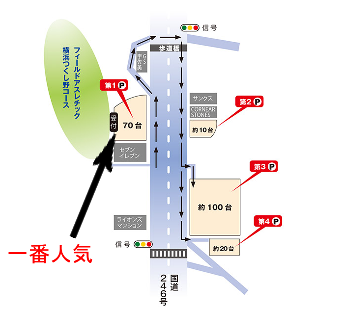 宇佐美というガソリンスタンドの看板が見えたら左折して、つくし野交差点で右に曲がって下さい。右折するとつくし野アスレチックの反対側の道路に出れ、第2~代4駐車場にとめれます。