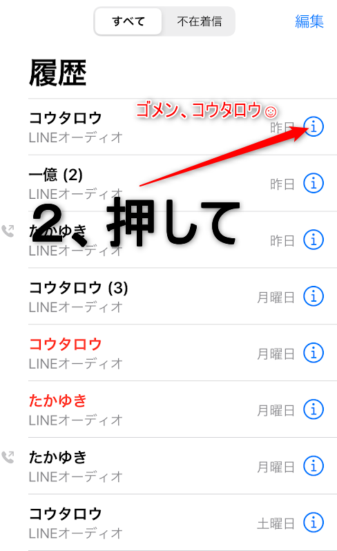 2、履歴から好きな番号を選び、青いiと書いてある場所を押して下さい。