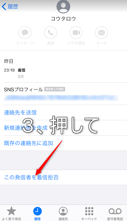 3、一番下にある「この発信者を着信拒否」と書いてある所をクリックしましょう。