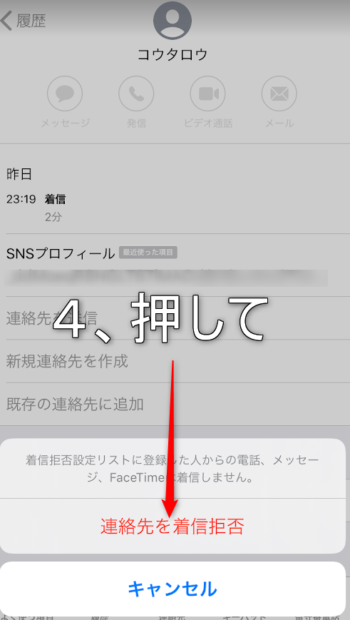 4、最後に「連絡先を着信拒否」を押して終わりです。