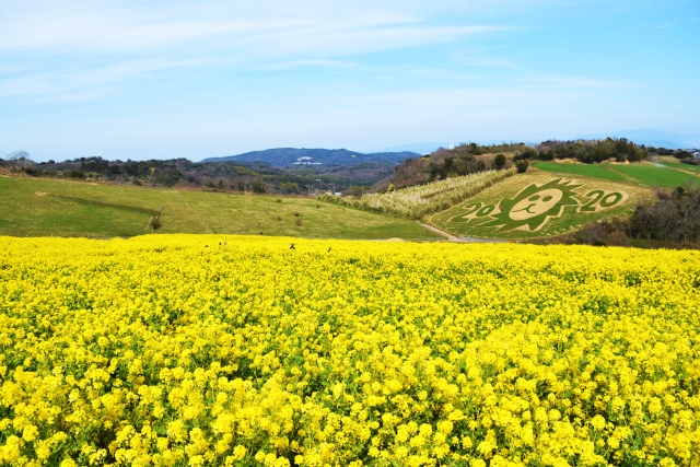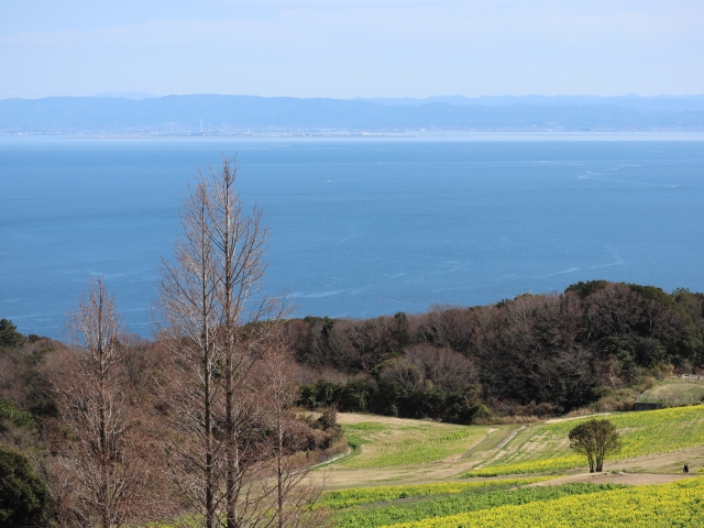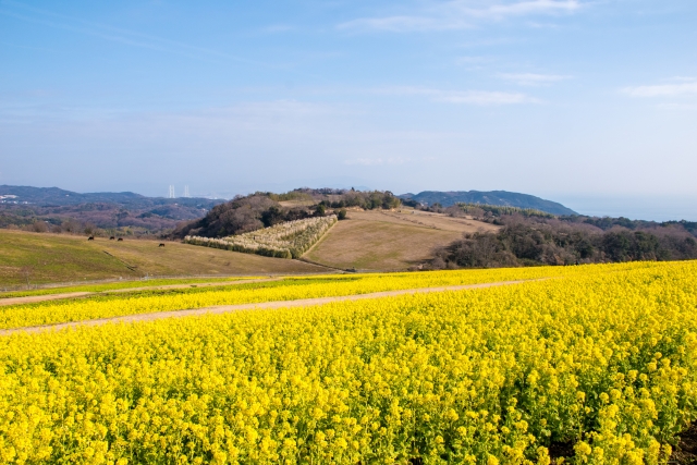あわじ花さじきでは、合計で約100万本の菜の花が順次開花します。天候の良い日には明石海峡大橋や大阪湾、関西国際空港などを望むことができます。