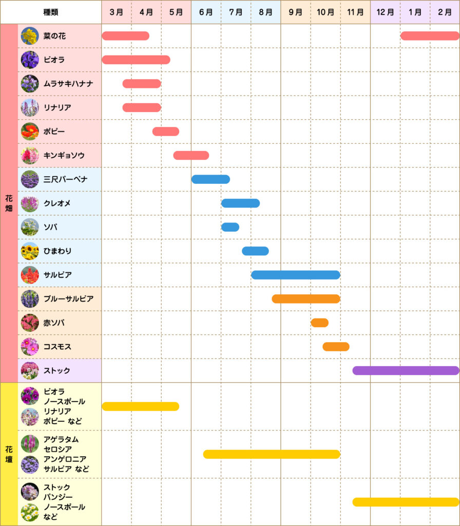 - 春はナノハナ、ムラサキハナナ、ポピー