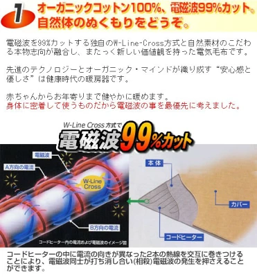 その根拠は、「コードヒーターの中に電流の向きが異なった2本の熱線を交互に巻き付ける事により電磁波同士が打ち消しあうからです」