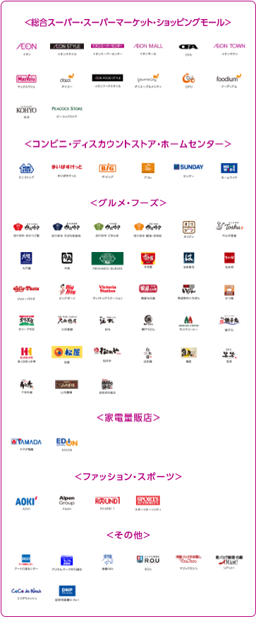 使える店舗 イオン、イオングループの加盟店、店舗数は不明(拡大中)