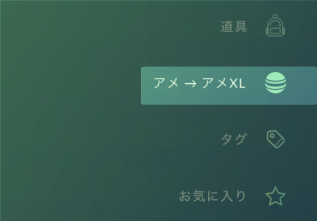 なので、XLアメが7個ゲットできます。交換方法はポケモンを選択して右下の三本線を押します。