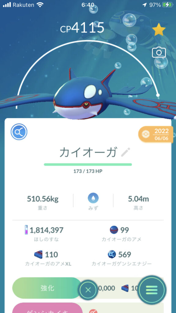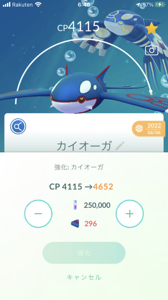 XLアメを使わないと最大で40レベルまでしか上げる事ができません。例えば、筆者が持っているカイオーガの最大CPレベル40まであげた場合は、CPは、4115です↓