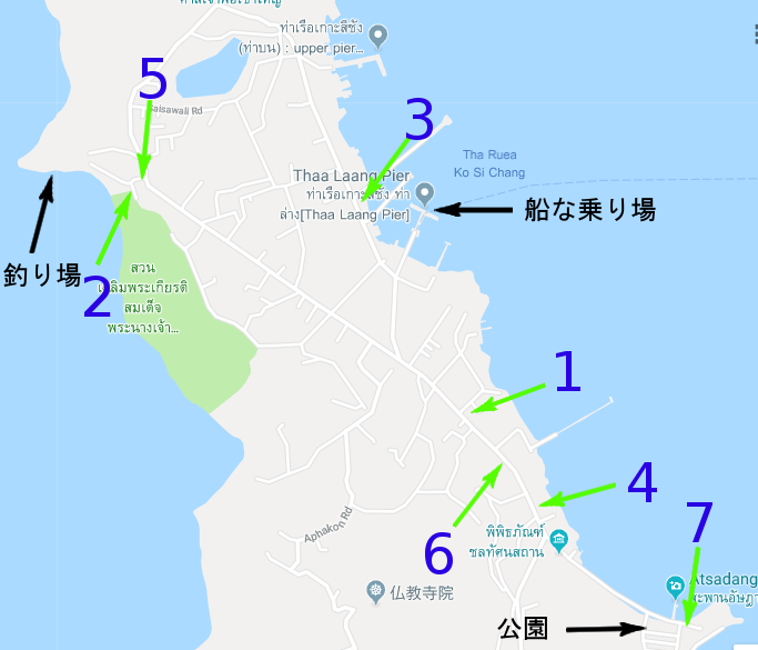 シーチャン島の移動する時の目印になる場所は、船乗り場から少し真っすぐ行った所にあるセブンイレブンが目印です。