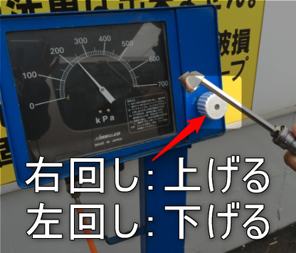 丸いダイヤルを右に回すと空気圧の針が上がります。
