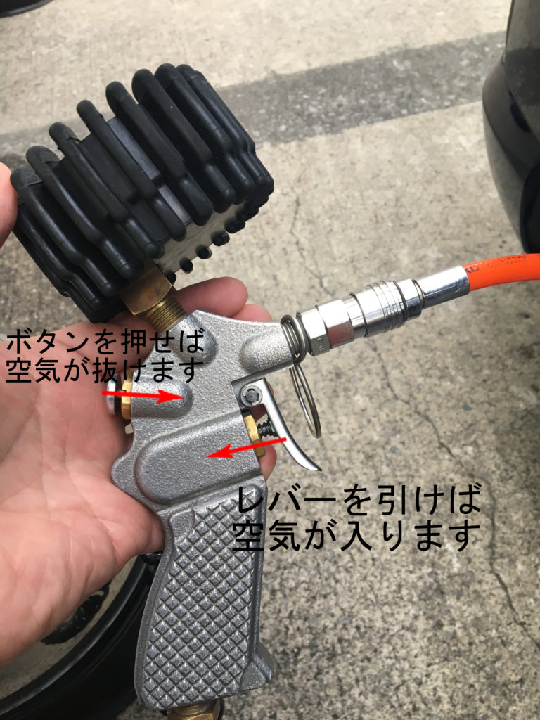 入れ終わったらレバーを押しながらタイヤから抜いてください。