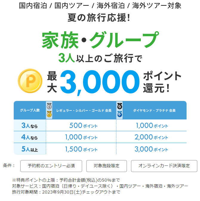 家族、グループ旅行(3人以上):最大3000ポイント還元