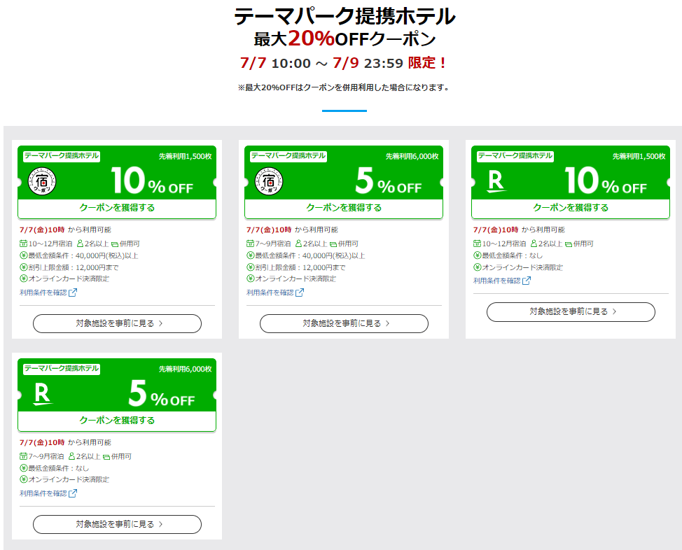 こちらは、テーマパークと提携しているホテル限定で7/7 10:00 ~ 7/9 23:59 限定!に予約した方が受け取れるクーポンです。