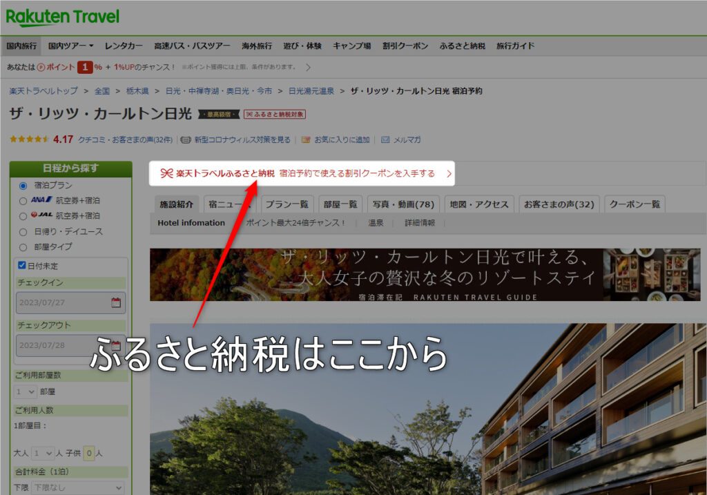 リッツカールトン日光は、ふるさと納税が適用できる宿泊施設です。