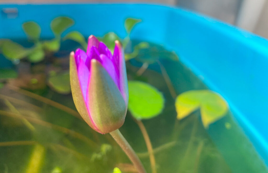 ただし、睡蓮の葉は、水温が5℃以下になると枯れ始めます。そのため、冬越しさせる場合は、葉が枯れ始める前に、水槽やバケツに植え込み鉢ごと水を張り、屋外の日当たりの良い場所に置いておきます。水が凍らないよう、水槽やバケツの周囲をビニールシートなどで覆っておくとよいでしょう。