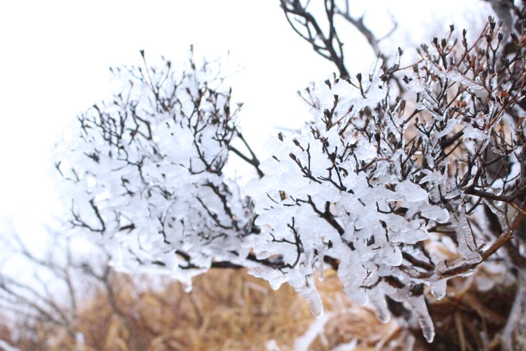 筆者達は、天候に恵まれていたおかげで、ケガをする事もなく無事に頂上に付けましたが、頂上の気温は2~3℃程度で、植物などは凍っていました。