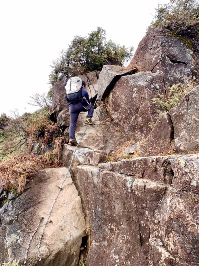 登っていくと、鎖が設置してある岩場も数か所存在して、天候が良い日でも濡れているので、かなり怖い思いをしました。
