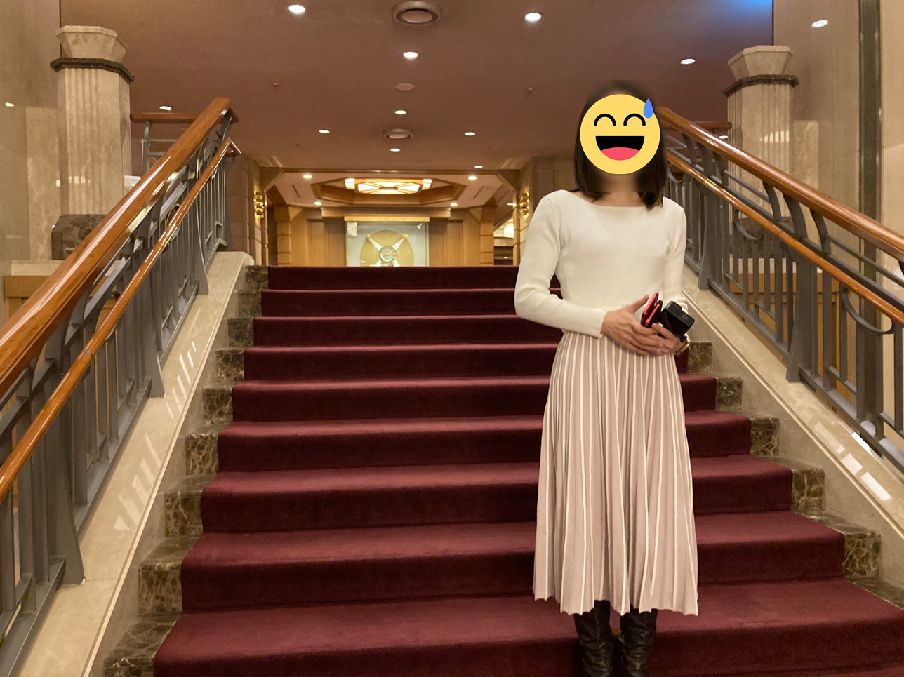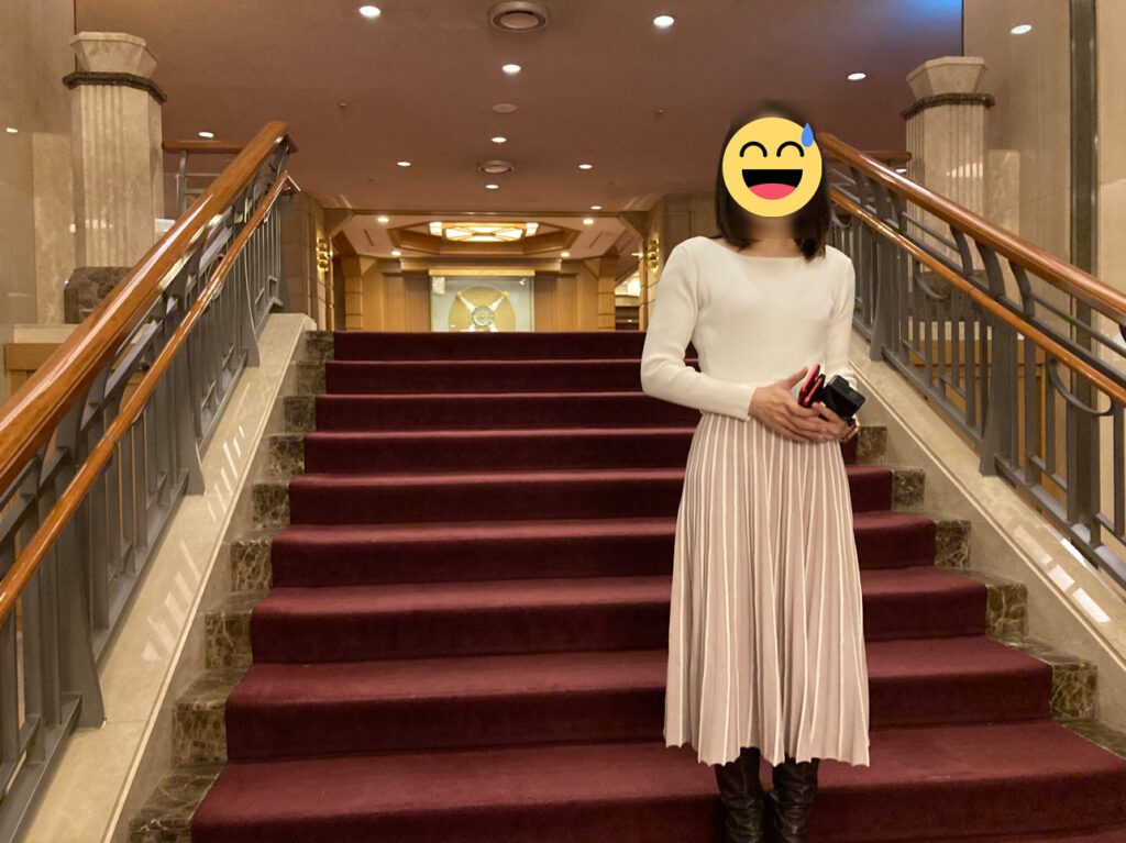 帝国ホテルの中は、落ち着いた色の照明を使っているので明るい色よりも落ち着いた色の服装がいいかと思います。