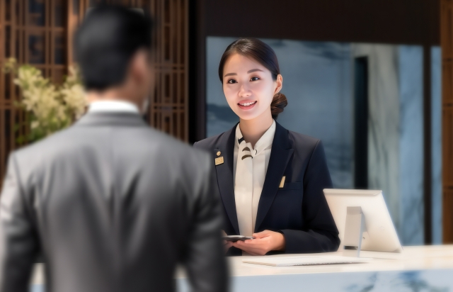チェックイン後は、荷物を部屋まで運んでくれるポーターさんもいます。部屋の説明や施設の案内も丁寧にしてくれます。