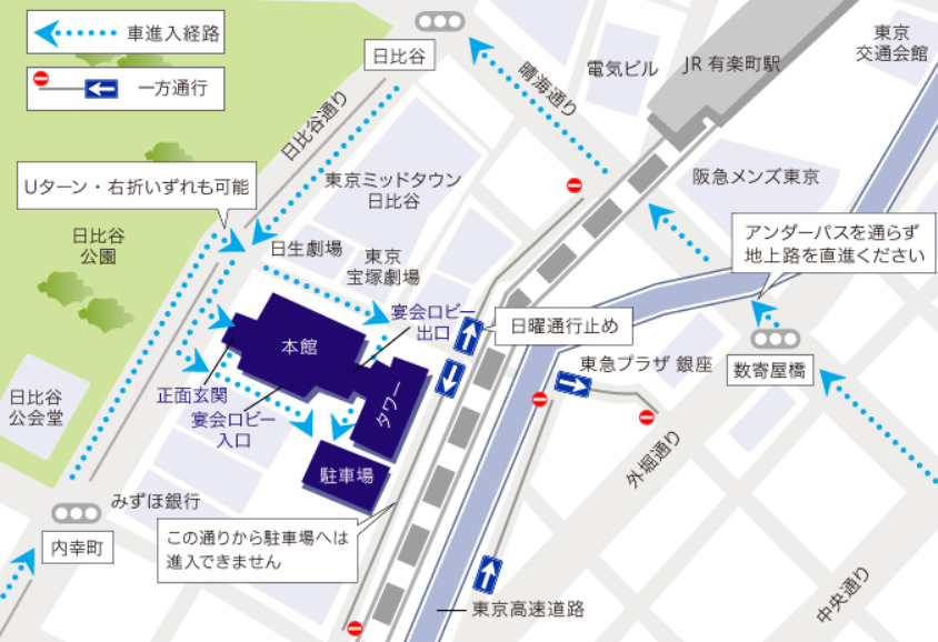 アクセス 東京駅~タクシーで約5分/【地下鉄】日比谷駅~徒歩3分、銀座駅~徒歩5分/【JR】有楽町駅~徒歩5分、新橋駅~徒歩7分