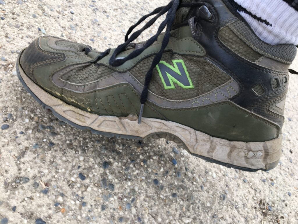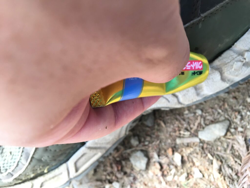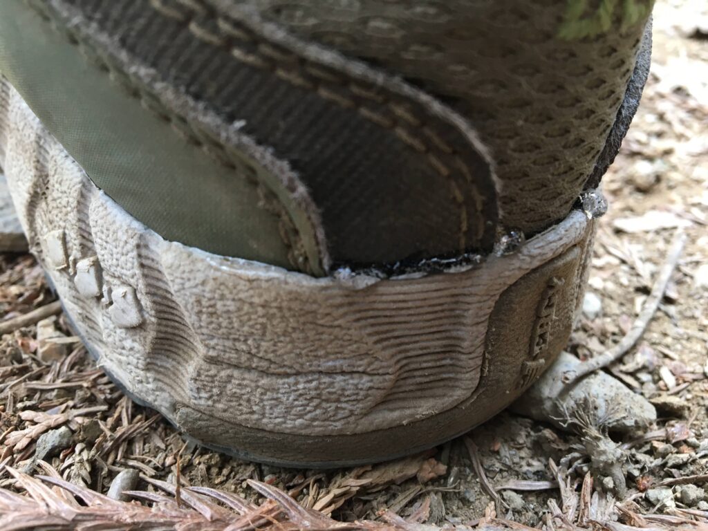 つま先のソールは耐えていましたが、後ろはパックリと剥がれて途中で応急処置をしましたが、最後はもうパカパカと剥がれて歩くことができない状態までに・・・