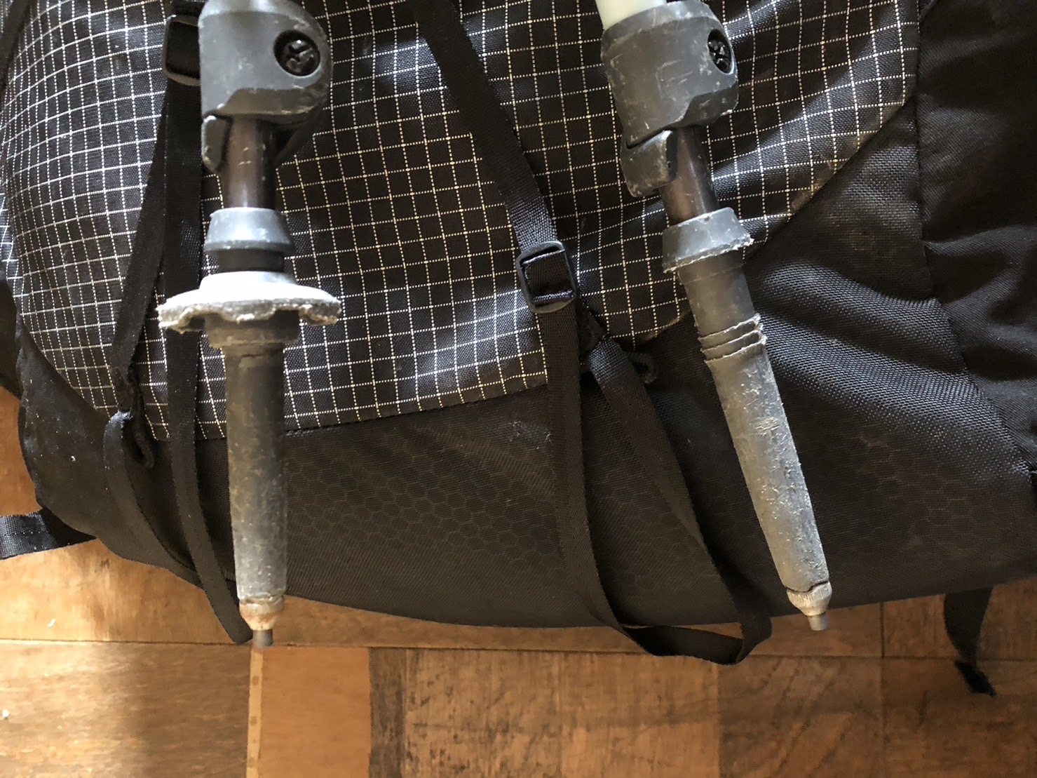 トレッキングポールのキャップを外すと、尖がった形状をしています。